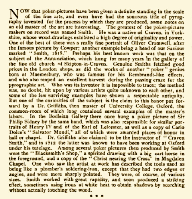 Charles Dickens, All the Year Round is the name of a weekly journal he "conducted" in conjunction with Chapman and Hall, who published it in London. In an 1870 article he wrote for that publication, he cited some of the important artists of pyrography, who worked in the 19th and even 18th centuries, as follows: