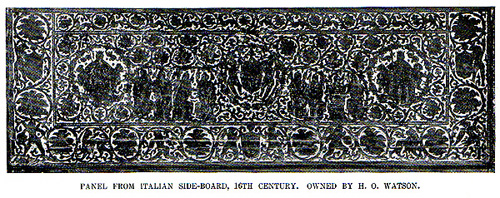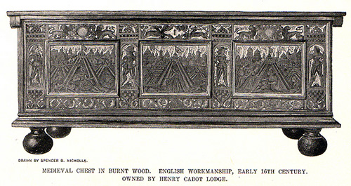 One example of an English cassone (chest) and another of a panel from an Italian sideboard are illustrated in the August 1896, Century Magazine article by James William Fosdick entitled Burnt Wood in Decoration: With Modern and Ancient Examples, Page 495 and Page 499 respectively.