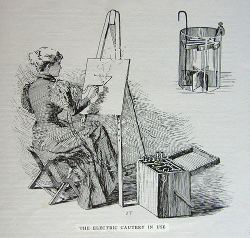 Excerpt and image of an engraving from WHEN AND HOW TO USE ORIENTAL LACQUERS, "Pyrography, Poker Painting, or Burnt Wood Etching," Chapter IX, pp. 27–28, published by Thayer & Chandler, Chicago, Illinois, 1925.